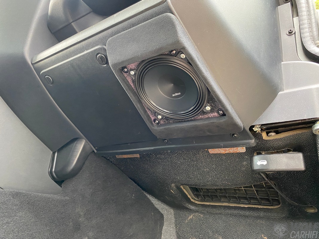 Im unteren Bereich kamen Audison Prima AP5 Tieftöner zum Einsatz, die wir in speziell angefertigten Adaptern auf 13 cm Durchmesser vergrößerten. Dadurch wird der Tieftonbereich deutlich kräftiger und präziser.